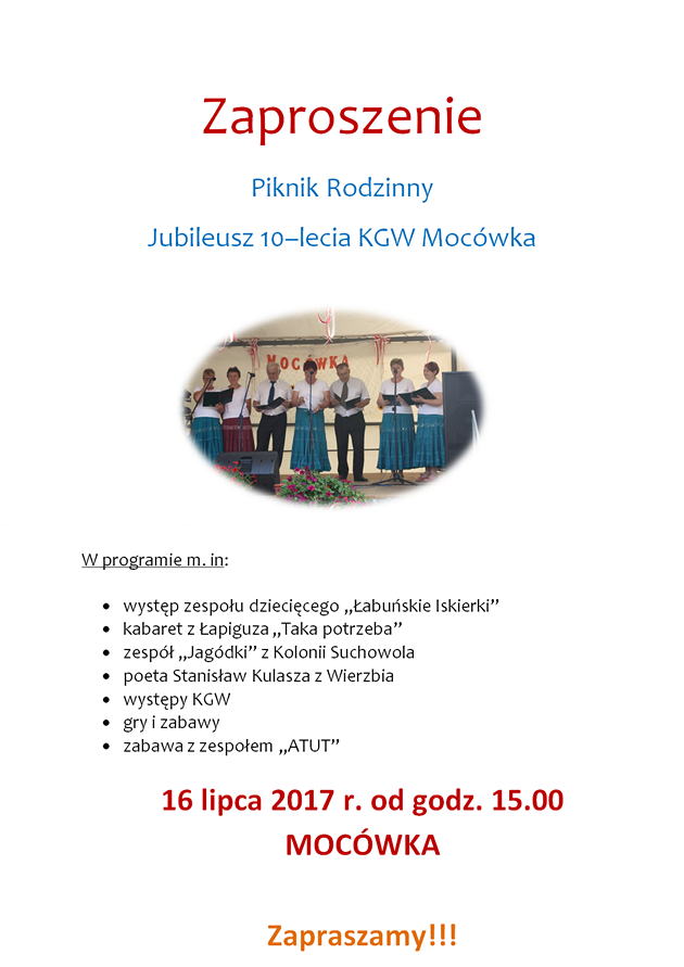 Wójt Gminy Łabunie, KGW Mocówka i Rada Sołecka wsi Mocówka zapraszają w niedzielę, 16 lipca 2017 r. od godz. 15.00 do Mocówki na piknik rodzinny i 10-lecie miejscowego KGW.