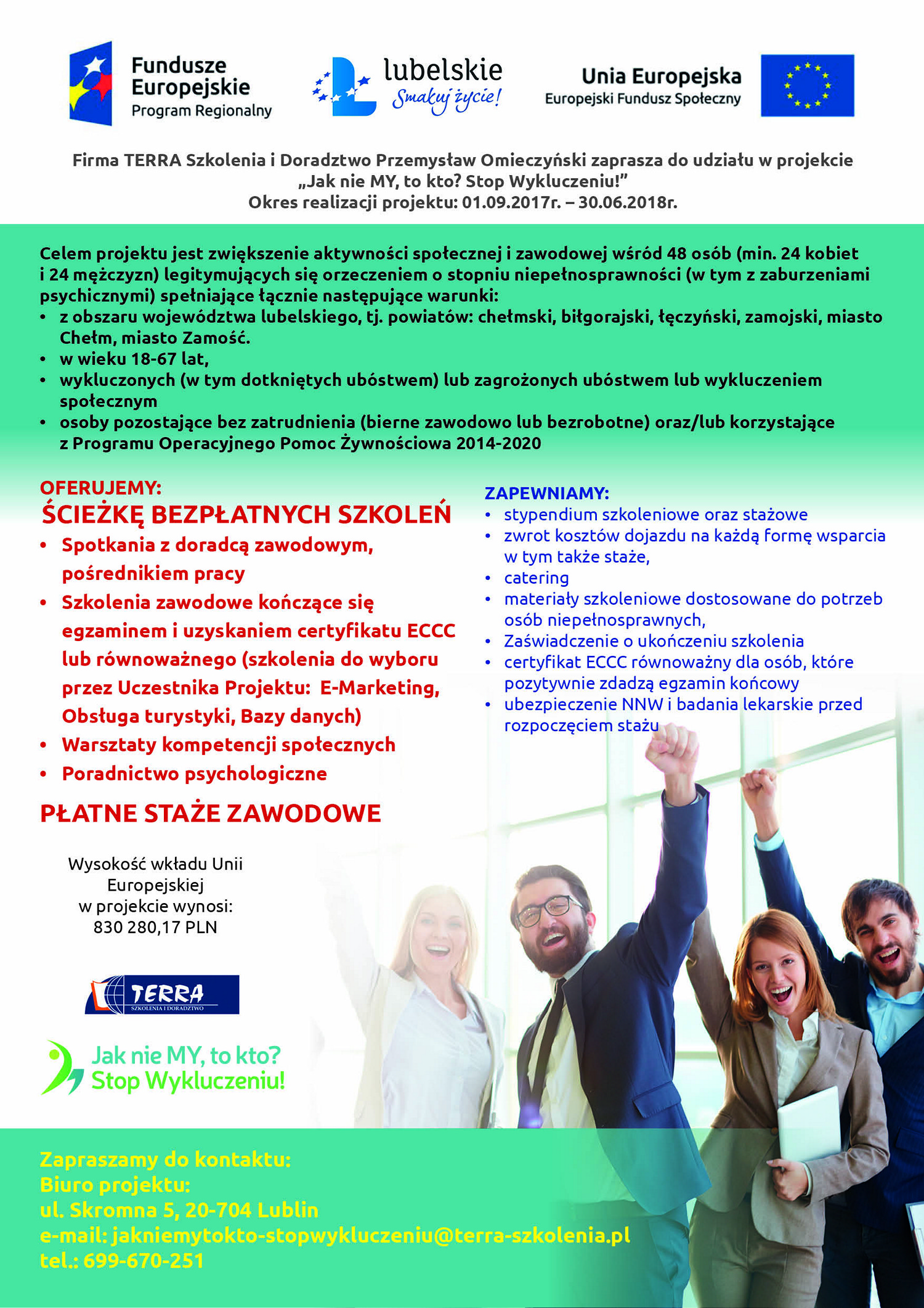 Firma TERRA Szkolenia i Doradztwo Przemysław Omieczyński zaprasza do udziału w projekcie „Jak nie MY, to kto? Stop Wykluczeniu!” realizowanego w ramach Regionalnego Programu Operacyjnego Województwa Lubelskiego na lata 2014-2020. Projekt współfinansowany jest przez Unię Europejską w ramach Europejskiego Funduszu Społecznego.