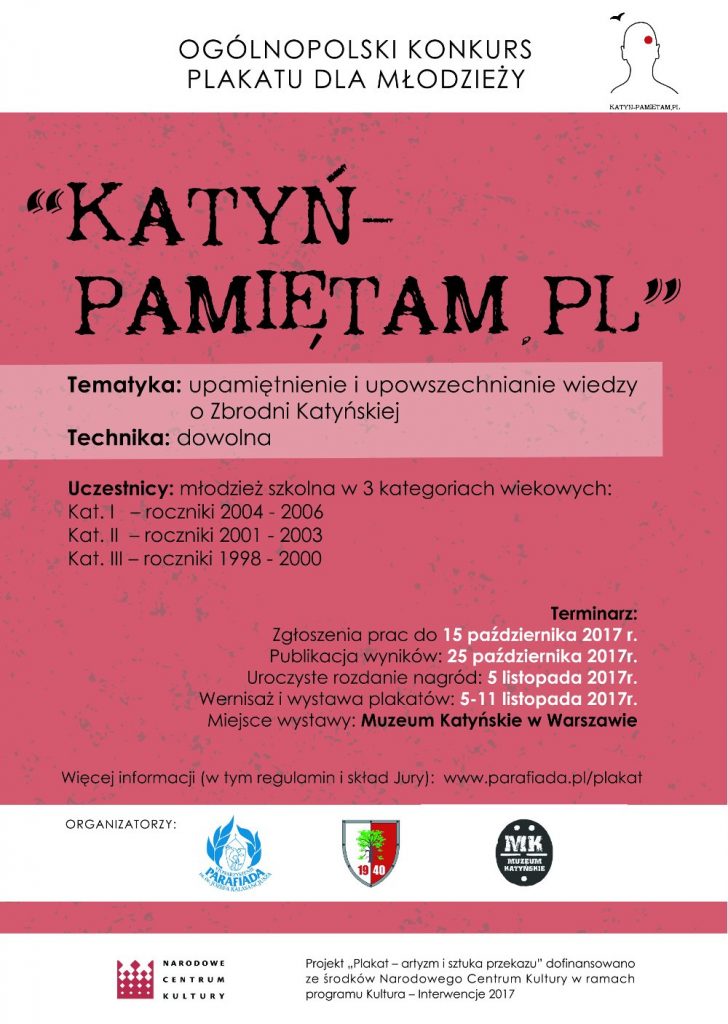 Zapraszamy do udziału w niosącym istotny przekaz otwartego konkursu plakatu pt. „Katyń-pamiętam.PL” dla młodzieży w wieku 11-18 lat (prace oceniane będą w 3 kategoriach wiekowych).