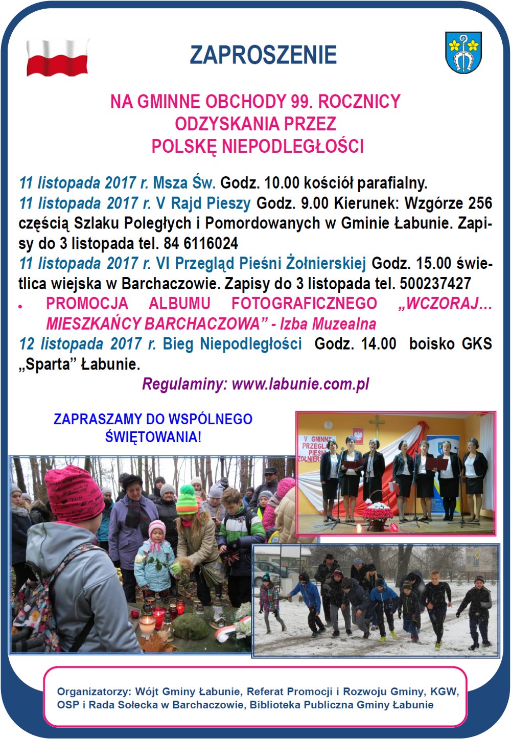 Wójt Gminy Łabunie, Referat Promocji i Rozwoju Gminy, Sołectwo Barchaczów, KGW i OSP Barchaczów oraz Biblioteka Publiczna Gminy Łabunie zapraszają na gminne obchody 99. rocznicy odzyskania przez Polskę Niepodległości.