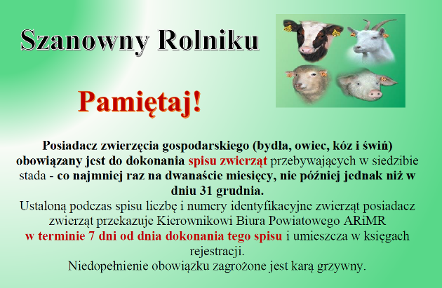 Kierownik Biura Powiatowego Agencji Restrukturyzacji i Modernizacji Rolnictwa w Zamościu przypomina o obowiązku dokonania spisu zwierząt przebywających w siedzibie stada – co najmniej raz na dwanaście miesięcy, nie później jednak niż w dniu 31 grudnia.