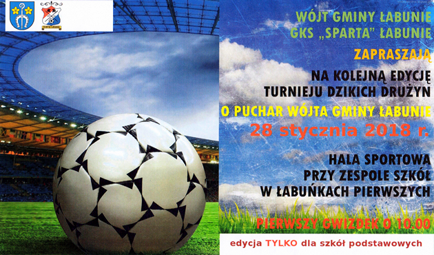 Wójt Gminy Łabunie i GKS “Sparta” Łabunie zapraszają 28 stycznia 2018 r. do hali sportowej przy Szkole Podstawowej w Łabuńkach Pierwszych na kolejną edycję turnieju dzikich drużyn o Puchar Wójta Gminy Łabunie. Pierwszy gwizdek o 10:00.