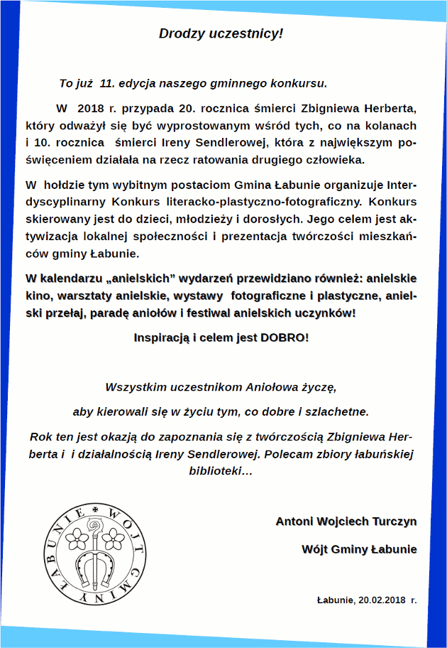 Referat Promocji i Rozwoju Gminy Łabunie i Biblioteka Publiczna Gminy Łabunie ogłaszają w roku Zbigniewa Herberta i Ireny Sendlerowej XI Konkurs dla Mieszkańców Gminy Łabunie w kategorii literackiej, plastycznej i fotograficznej – ANIOŁOWO. Patronat nad interdyscyplinarnym konkursem objęli Wójt Gminy Łabunie i Proboszcz Parafii Łabunie.