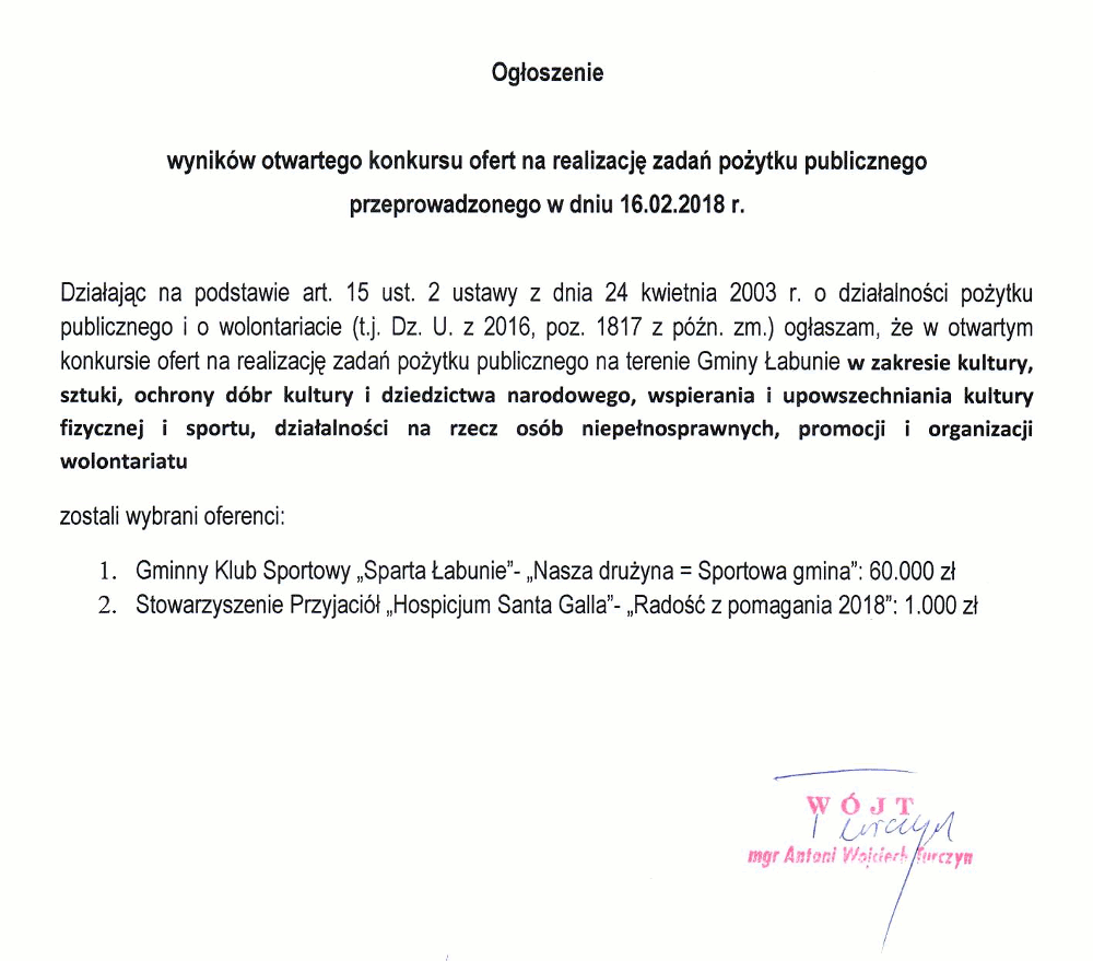 Ogłoszenie otwartego konkursu ofert na realizację zadań pożytku publicznego przeprowadzonego w dniu 16 lutego 2018 r.