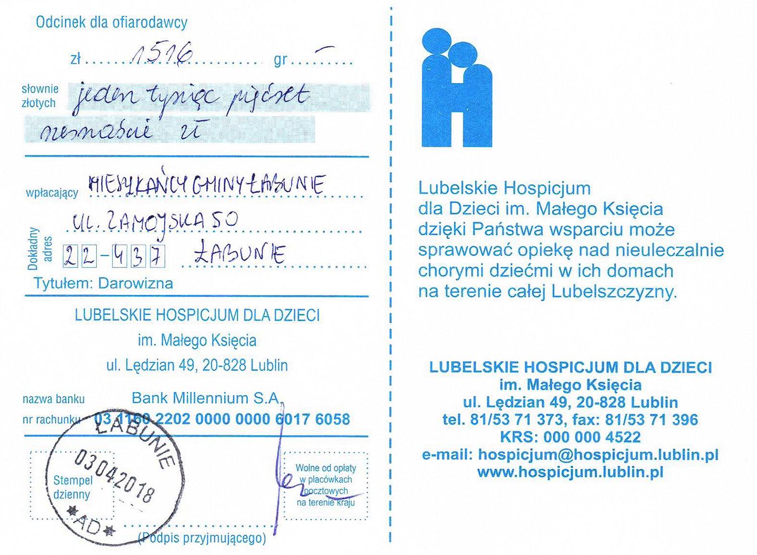 Dziękujemy wszystkim Ludziom Dobrej Woli za pomoc i wsparcie finansowe hospicjum.