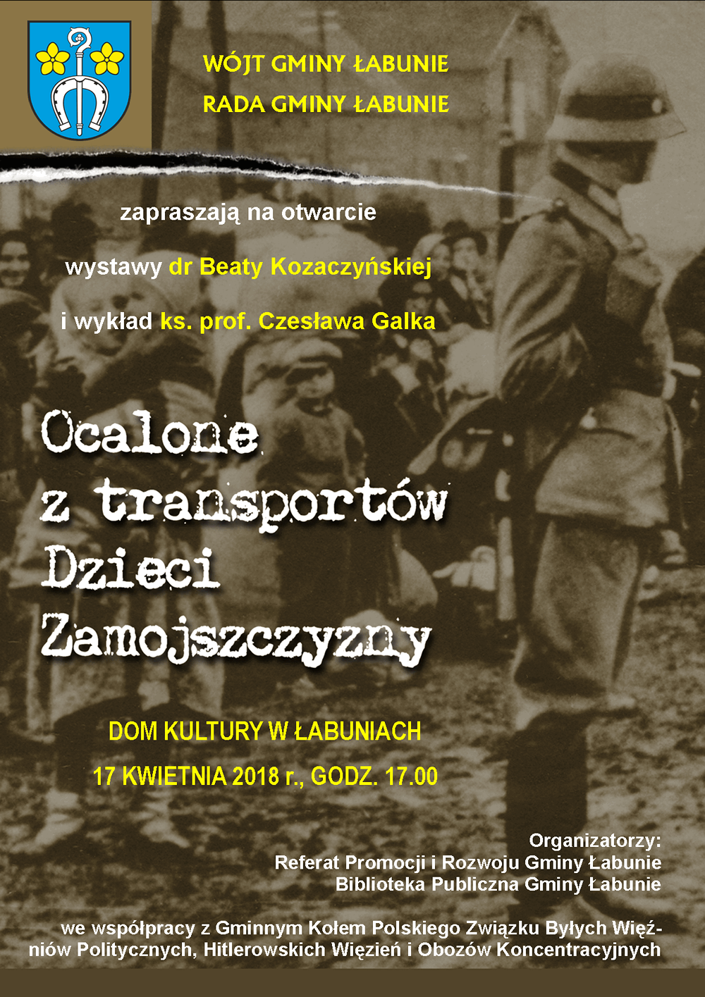 Od 9 kwietnia w sali konferencyjnej Domu Kultury w Łabuniach można oglądać wystawę dr Beaty Kozaczyńskiej (UP-H w Siedlcach) „Ocalone z transportów Dzieci Zamojszczyzny”. Oficjalne otwarcie wystawy z udziałem dorosłych Dzieci Zamojszczyzny: 17 kwietnia 2018 r. godz. 17.00. W programie m.in: wykład ks. prof. Czesława Galka. Spotkanie z Autorką odbędzie się 3 maja 2018 r. godz. 12.30 w zespole pałacowo-parkowym w Łabuniach. Serdecznie zapraszamy!