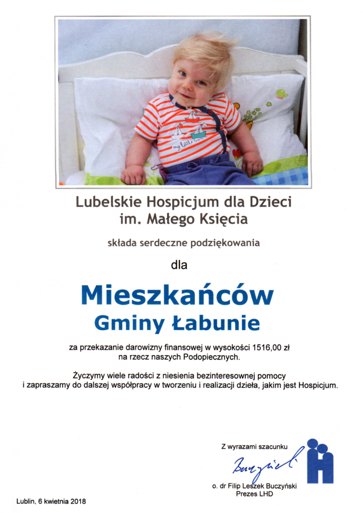 Lubelskie Hospicjum dla Dzieci im. Małego Księcia przesyła podziękowania dla Mieszkańców Gminy Łabunie za przekazanie darowizny na rzecz Podopiecznych hospicjum. Środki finansowe zostały zebrane podczas trwającego tydzień kiermaszu wielkanocnego zamykającego 9. edycję Gminnego Konkursu Plastycznego „Przed Wielkanocą”.
