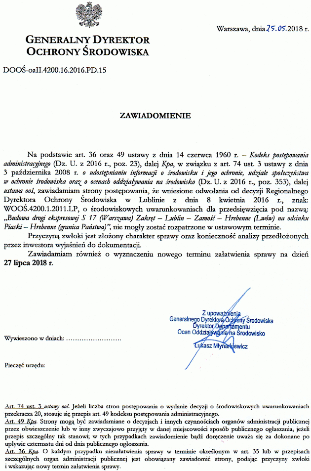 Generalny Dyrektor Ochrony Środowiska zawiadamia o wyznaczeniu nowego terminu rozstrzygnięcia odwołań od decyzji w sprawie środowiskowych uwarunkowań dla przedsięwzięcia pod nazwą “Budowa drogi ekspresowej S17 (Warszawa) Zakręt – Lublin – Zamość – Hrebenne (Lwów) na odcinku Piaski – Hrebenne (granica Państwa).