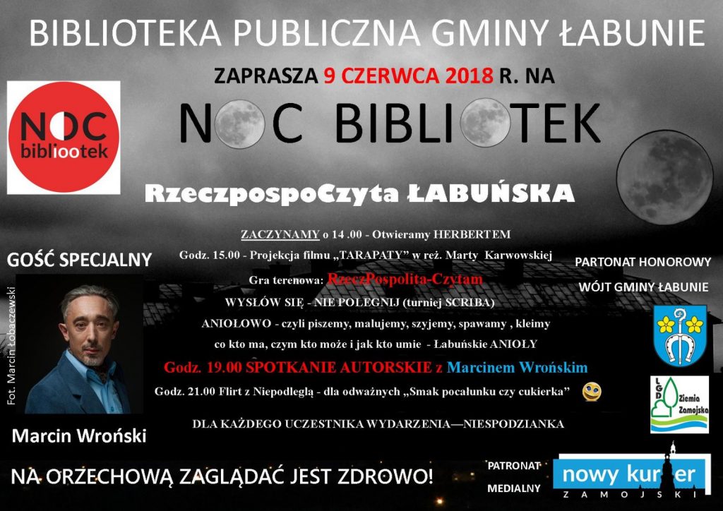 9 czerwca od godz. 14.00 zapraszamy Państwa do Biblioteki Publicznej Gminy Łabunie na NOC BIBLIOTEK. W programie m.in.: gra terenowa “RzeczPospolita – Czytam”, scriba, Łabuńskie Anioły.