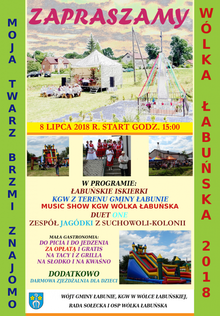 Wójt Gminy Łabunie, Koło Gospodyń Wiejskich, Rada Sołecka i Ochotnicza Staż Pożarna w Wólce Łabuńskiej zapraszają 8 lipca do Wólki Łabuńskiej na Biesiadę Kabaretową.