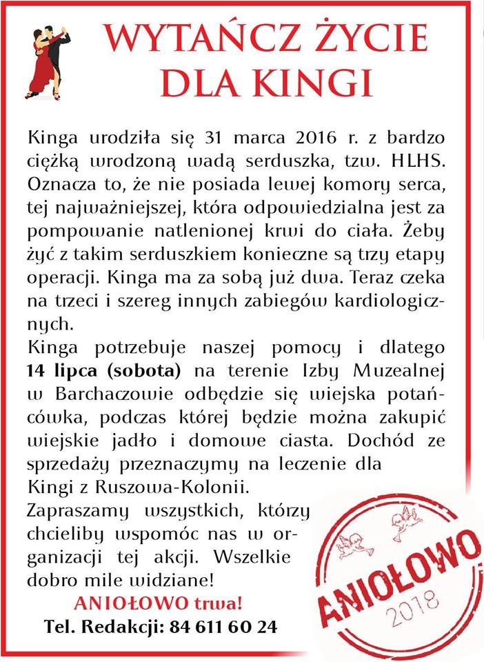Towarzystwo Przyjaciół Gminy Łabunie im. Jana Jakuba Zamoyskiego zaprasza w sobotę, 14 lipca o godz. 17:00 do Izby Muzealnej w Barchaczowie na potańcówkę wiejską “Wytańcz życie dla Kingi”.
