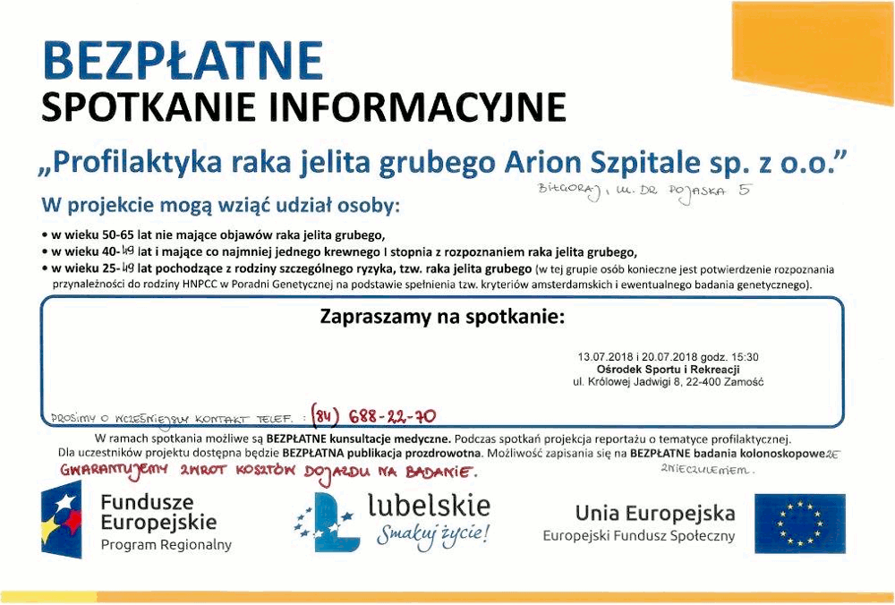 Arion Szpitale sp. z o.o w Biłgoraju zaprasza na bezpłatne badania kolonoskopowe wraz ze znieczuleniem w ramach profilaktyki raka jelita grubego. Organizowane są dwa spotkania informacyjne w Zamościu 13 i 20 lipca 2018 r. o godzinie 15:30 w Ośrodku Sportu i Rekreacji, ul. Królowej Jadwigi 8.