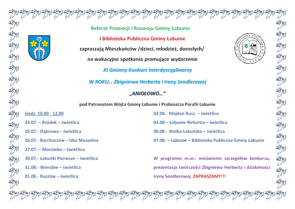 Referat Promocji i Rozwoju Gminy Łabunie i Biblioteka Publiczna Gminy Łabunie zapraszają Mieszkańców (dzieci, młodzież, dorosłych) na wakacyjne spotkania promujące wydarzenie XI Gminny Konkurs Interdyscyplinarny W ROKU… Zbigniewa Herberta i Ireny Sendlerowej “ANIOŁOWO…” pod Patronatem Wójta Gminy Łabunie i Proboszcza Parafii Łabunie.