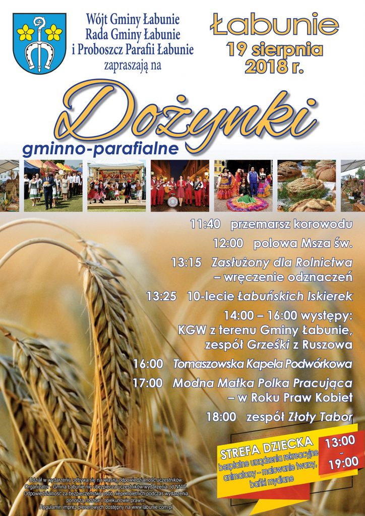 Wójt Gminy Łabunie, Rada Gminy Łabunie i Proboszcz Parafii Łabunie zapraszają 19 sierpnia 2018 r. na Dożynki Gminno-Parafialne.