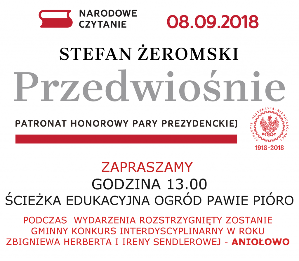 Wójt Gminy Łabunie zaprasza 8 września 2018 r. do ogrodu “Pawie Pióro” w Łabuniach na Narodowe Czytanie pod honorowym patronatem pary prezydenckiej. W tym roku czytamy „Przedwiośnie” Stefana Żeromskiego. Startujemy godz. 13.00.
