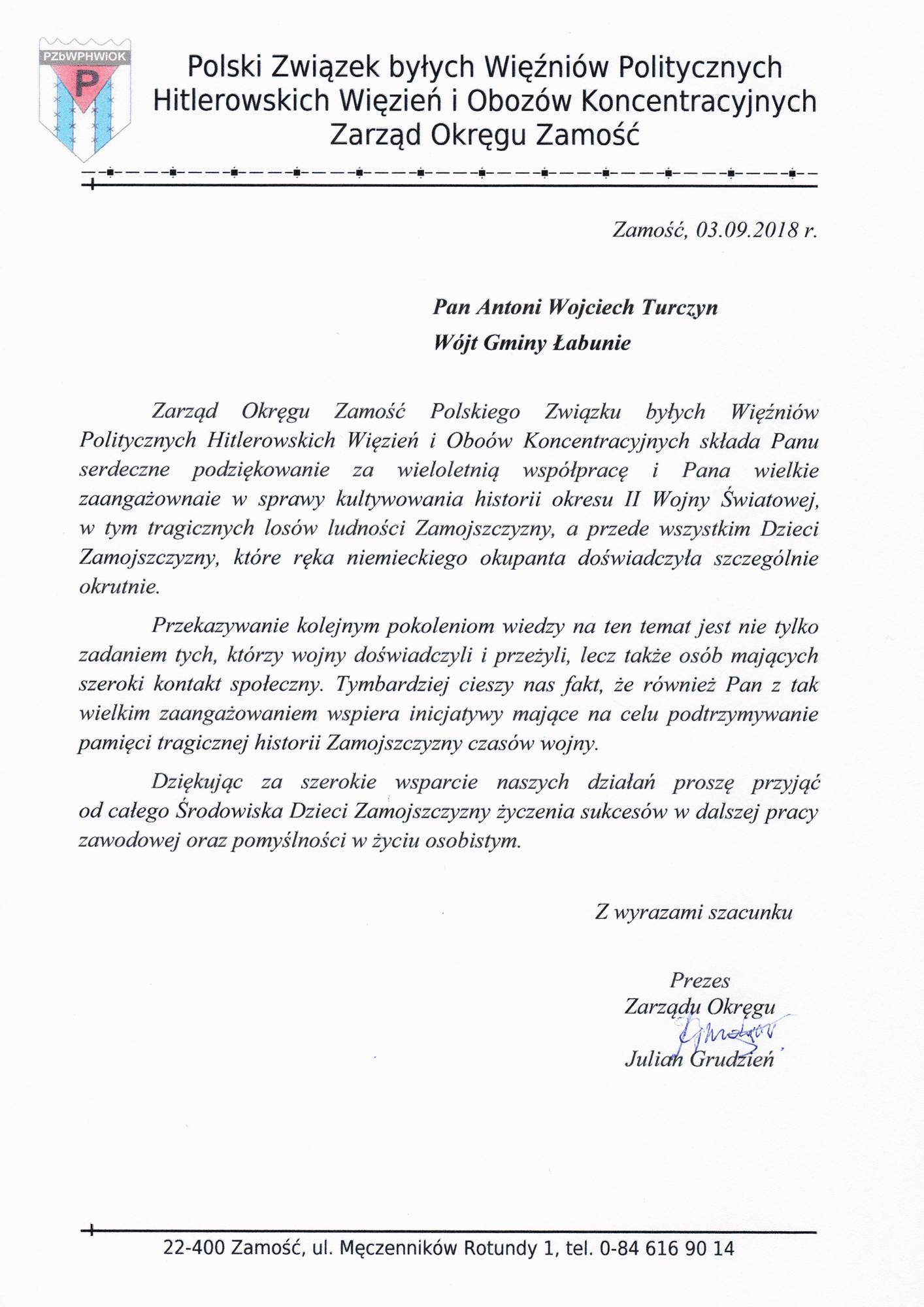 Poświęcenia tablicy o treści „PAMIĘCI Tych, którym okupant niemiecki odebrał dzieciństwo Dzieciom Zamojszczyzny z terenu Gminy Łabunie – Społeczność Gminy Łabunie” dokonał ks. Proboszcz Piotr Rawlik. W trakcie uroczystości Lucjan Gnyp Wiceprezes Honorowy Zarządu Okręgu Zamość Polskiego Związku byłych Więźniów Politycznych, Hitlerowskich Więzień i Obozów Koncentracyjnych wręczył Wójtowi Gminy Łabunie podziękowanie za wieloletnią współpracę i „wielkie zaangażowanie w sprawy kultywowania historii okresu II Wojny Św., w tym tragicznych losów ludności Zamojszczyzny, a przed wszystkim Dzieci Zamojszczyzny, które ręka niemieckiego okupanta doświadczyła szczególnie okrutnie.”