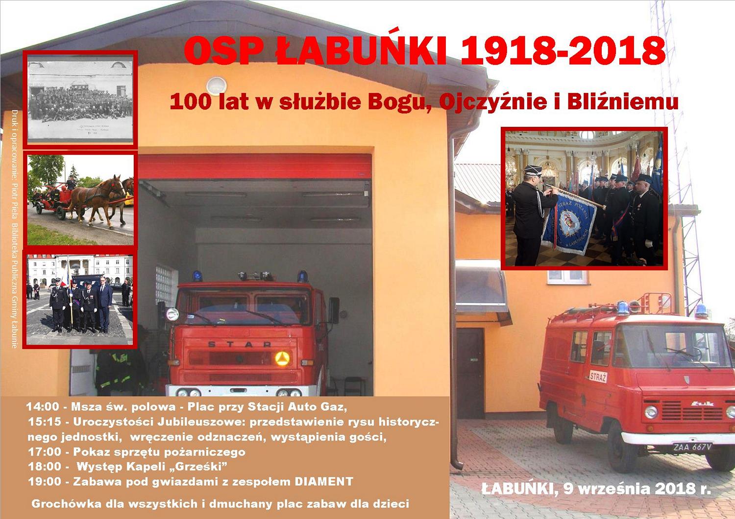 Zarząd Ochotniczej Straży Pożarnej w Łabuńkach zaprasza 9 września 2018 r. o godz. 14:00 na obchody Jubileuszu 100-lecia działalności OSP Łabuńki.