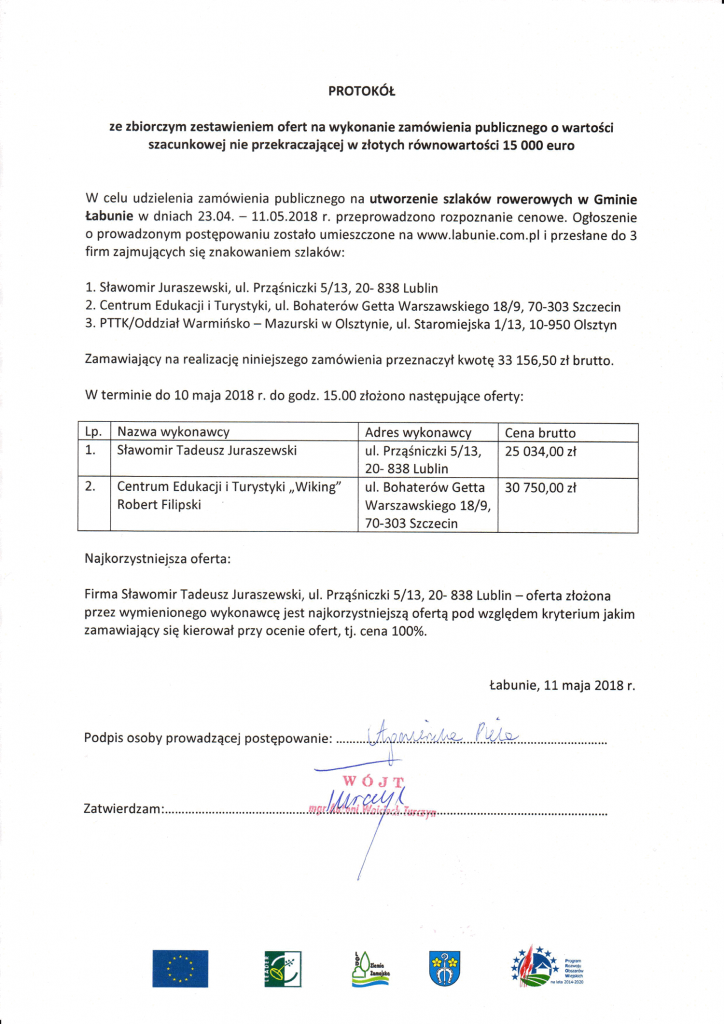 Protokół ze zbiorczym zestawieniem ofert na wykonanie zamówienia publicznego o wartości szacunkowej nie przekraczającej w złotych równowartości 15000 euro w celu udzielenia zamówienia publicznego na utworzenie szlaków rowerowych w Gminie Łabunie.