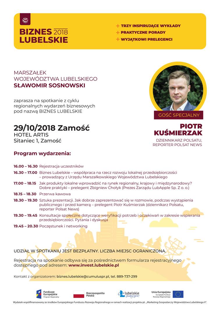 Podczas wydarzenia pracownicy UMWL przedstawią możliwości atrakcyjnego wsparcia działalności firm, m.in. w zakresie promocji, udziału w targach i misjach zagranicznych. Z kolei lokalny przedsiębiorca, Zbigniew Chołyk – Prezes Zarządu LubApple Sp. z o.o. opowie jak odnieść sukces w biznesie na Lubelszczyźnie. O tym, jak najlepiej zaprezentować swoją firmę i siebie podczas publicznych wystąpień, rozmów biznesowych i kontaktów z mediami poprowadzi Piotr Kuśmierzak – reporter Polsat News oraz dziennikarz Polsat. Zakończeniem spotkania jest wspólna kolacja uczestników z prelegentami, podczas której będzie można osobiście nawiązać nowe znajomości i poznać innych przedstawicieli firm i samorządów.