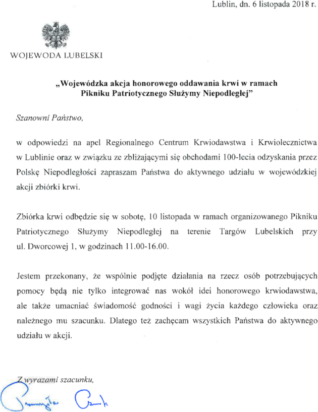 Wojewoda Lubelski Przemysław Czarnek zaprasza do dołączenia do “Wojewódzkiej akcji honorowego oddawania krwi w ramach Pikniku Patriotycznego Służymy Niepodległej”.